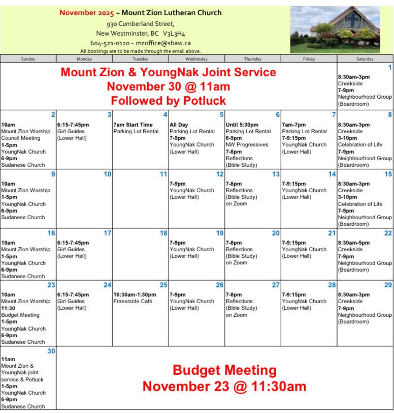 Jul 6 Sun July 06, 2031 from 01:00 PM to 05:00 PM America/Vancouver Repeats Weekly YoungNak Community Church Whole Building Additional Dates November 09, 2025 from 01:00 PM to 05:00 PM November 16, 2025 from 01:00 PM to 05:00 PM November 23, 2025 from 01:00 PM to 05:00 PM November 30, 2025 from 01:00 PM to 05:00 PM December 07, 2025 from 01:00 PM to 05:00 PM December 14, 2025 from 01:00 PM to 05:00 PM December 21, 2025 from 01:00 PM to 05:00 PM
